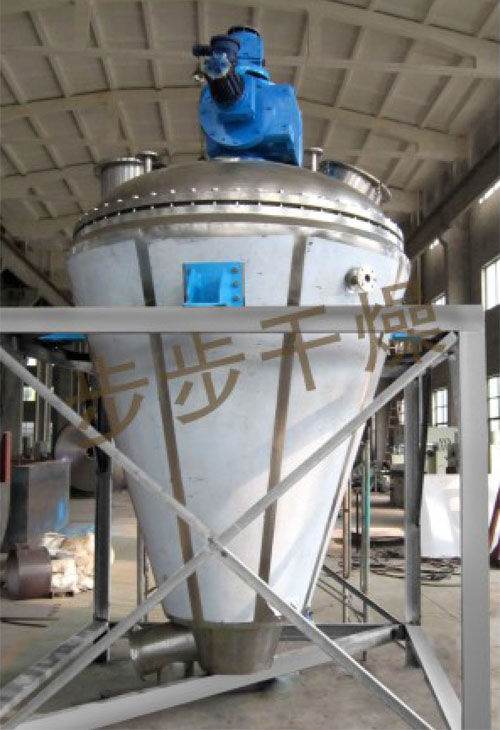 1.单锥真空混合干燥机中的物料在容器内受热是紧贴容器内壁,由螺旋桨叶自下而上旋转至容器上部,然后沿主轴呈涡流向下。物料在整个干燥过程中始终在分散运动。物料的运动状态保证了物料的均衡受热。